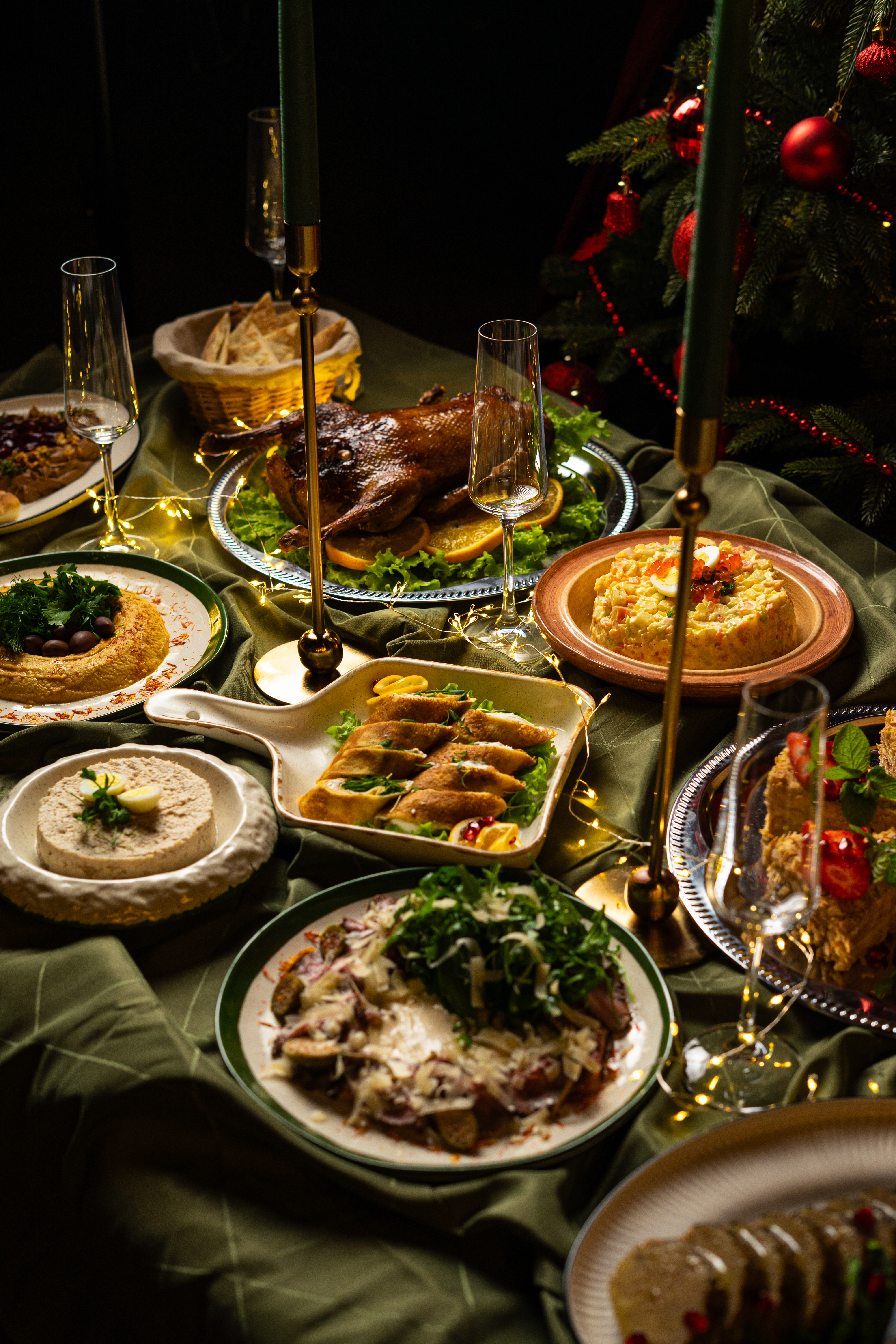 Олівє з лососем (1 кг) <br> Млинці з лососем (0,3 кг) <br> Форшмак (0,3 кг) <br> Кремовий хумус із нуту (0,3 кг) <br> Соковита класична фарширована риба (0,5 кг) <br> Мариновані маслини та оливки (0,2 кг) <br> Паштет із курячої печінки з вишневим конфітюром (0,3 кг) <br> Вітелло-тоннато (0,3 кг) <br> Запечена качка (з апельсином та яблуком) (1 шт,) <br> Торт Медовик (1 кг) <br> Домашній лимонад (1 л) <br>