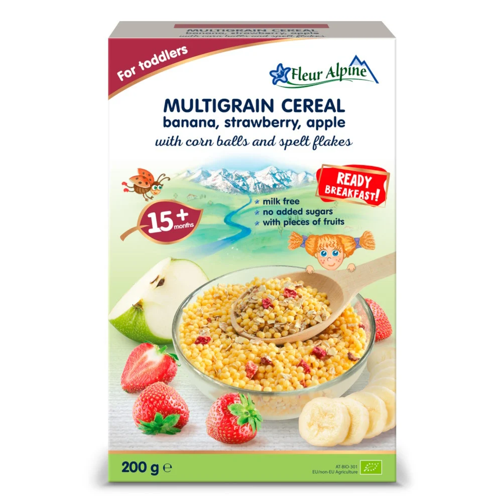 Безмолочна мультизлакова органічна каша Fleur Alpine з бананом, зі шматочками полуниці і яблука,200г