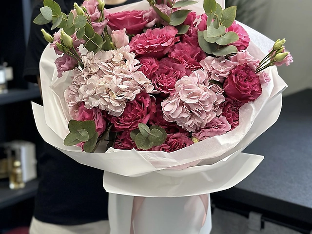 Витончений, проте обʼємний букет, зібраний професійним флористом. В складі присутні гортензіі, піоноподібні троянди та декоративна зелень. Через сезонність та особливості зберігання квітів ваше замовлення може відрізнятися від фото, проте це суттєво не вплине на зовнішній вигляд букету: кольорова гамма, розмір, стиль та ціна будуть збережені