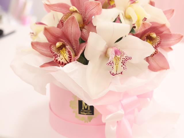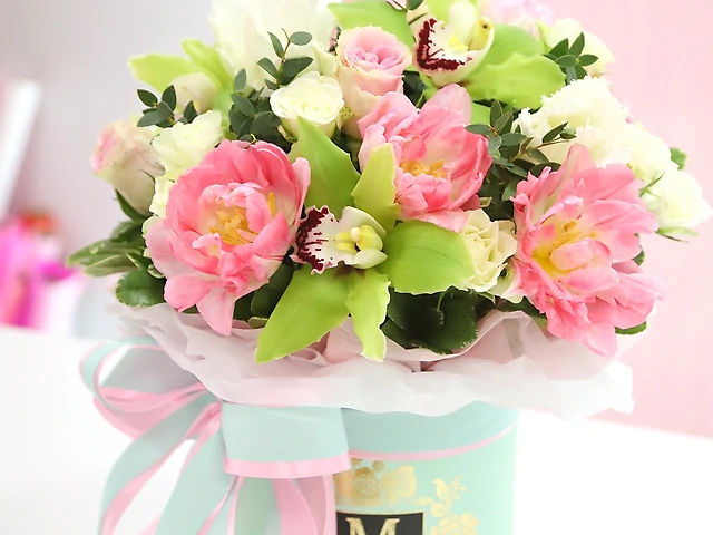 Шляпная коробка с радужной гипсофилой. На фото Размер -средний .