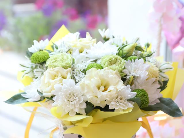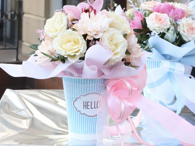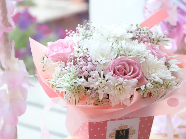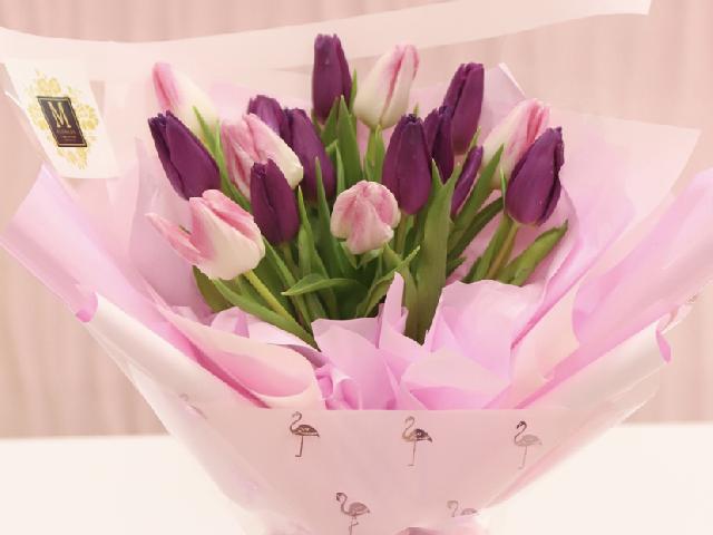Букет в бело-розовых тонах с тюльпанами, розами, эустомой и зеленью.