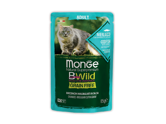 MONGE CAT WET BWild Cod Fish&Shrimp пауч, тріска з креветками, шматочки в соусі 85г