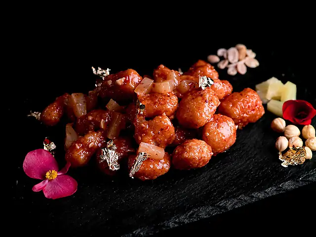 Лосось темпура, айсберг, чері, соус медово-гірчичний, соєвий соус, кунжут, норі.