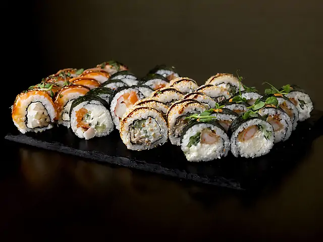Футомакі з креветкою, філадельфія в кунжуті з лососем