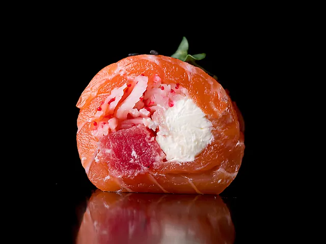 Лосось, тунець, сніжний краб, ікра летючої риби, соус буда, крем-сир, горіховий соус, кунжут.