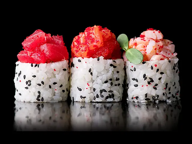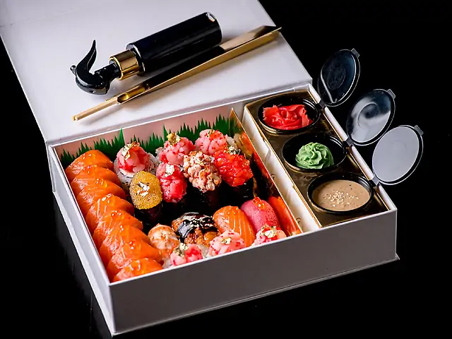 Рол з лососем, рол з крабом і фелікс з гребінцем, суші з лососем, суші з тунцем, суші з креветкою, гункан з лососем та ікрою летючої риби, гункан з щучою ікрою, гункан з тунцем та ікрою летючої риби