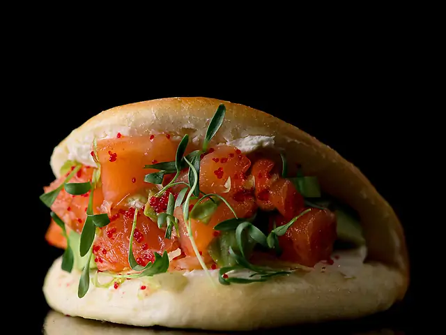 Тунець, лосось, сніжний краб, ікра летючої риби, соус буда, крем-сир, горіховий соус, кунжут.
